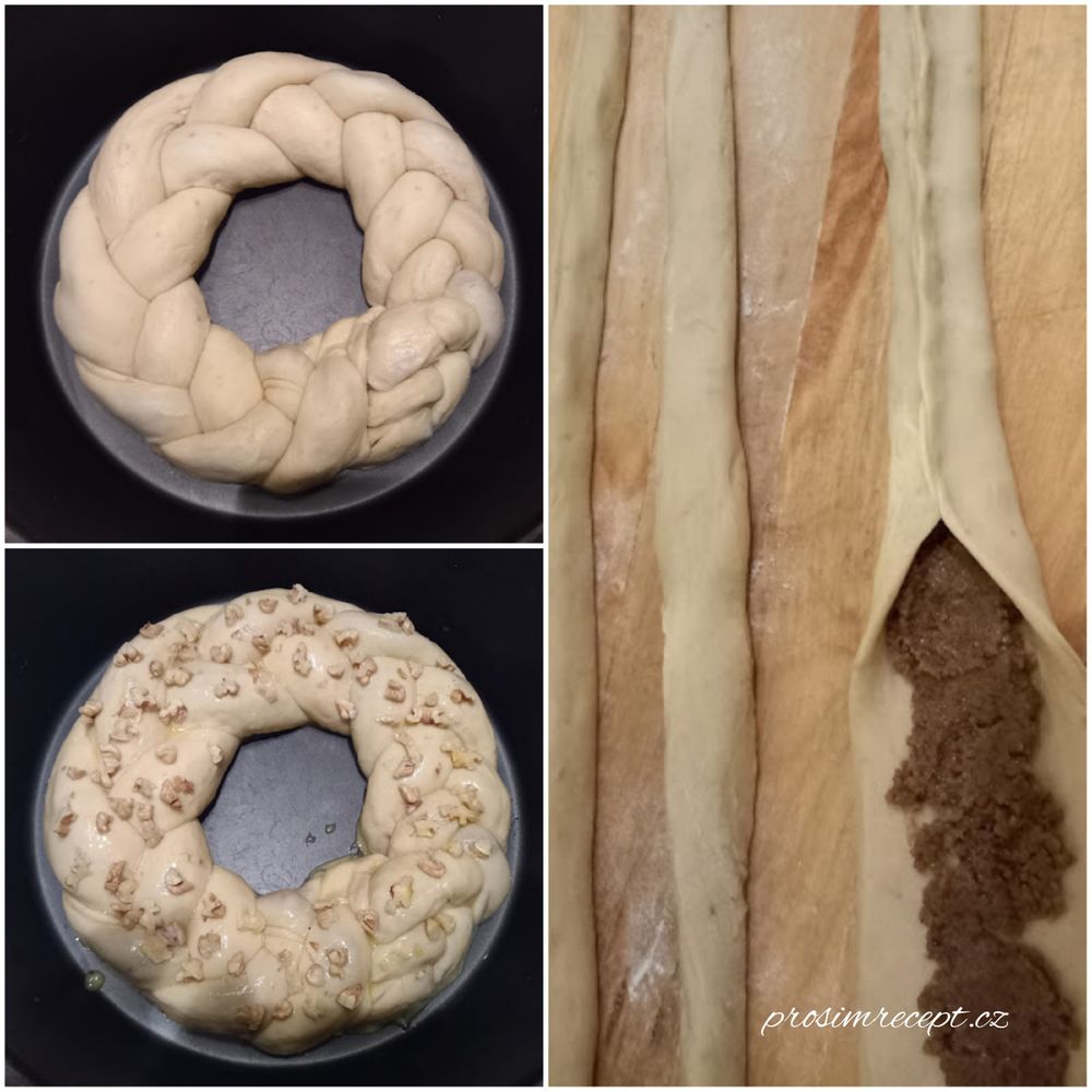 Vykynuté těsto rozdělíme na tři kusy, ty necháme asi 30 minut odpočinout a potom z nich vyválíme tři válečky, ty rozválíme a namažeme nádivkou, každý stočíme. Z naplněných válečků upleteme cop který stočíme do tvaru věnce a vložíme do studené remosky kde kyne asi 2-3 hodiny. Vykynutý věnec potřeme vejcem a posypeme sekanými ořechy nebo mandlemi.