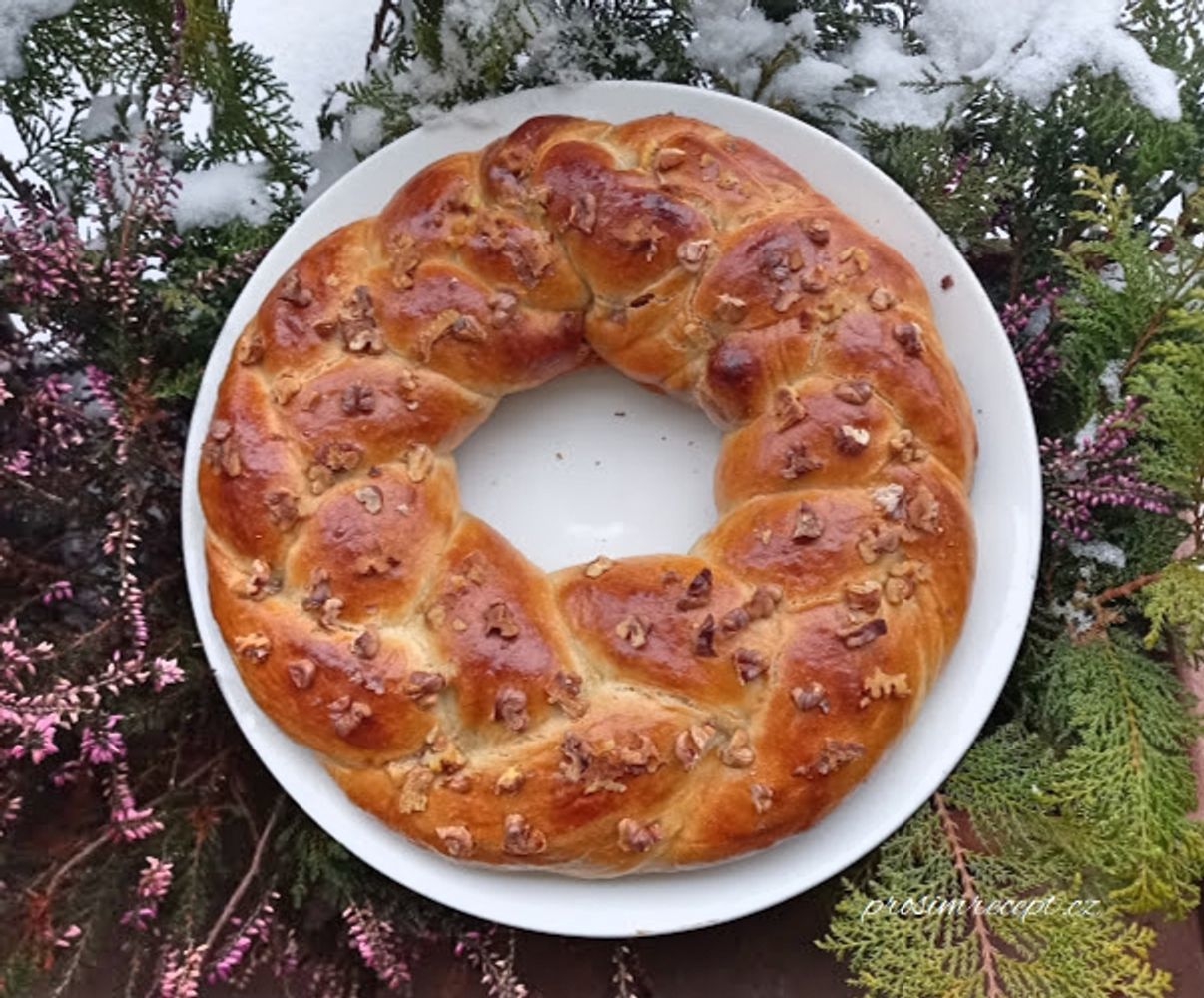 Věnec nadívaný ořechovou nádivkou, pečený v remosce, je z těsta s pšeničným kvasem Lievito Madre - LM. K pečení používáme vždy občerstvený zralý kvas. Do náplně můžeme přidat i ovocnou nádivku z ostružinové dřeně.