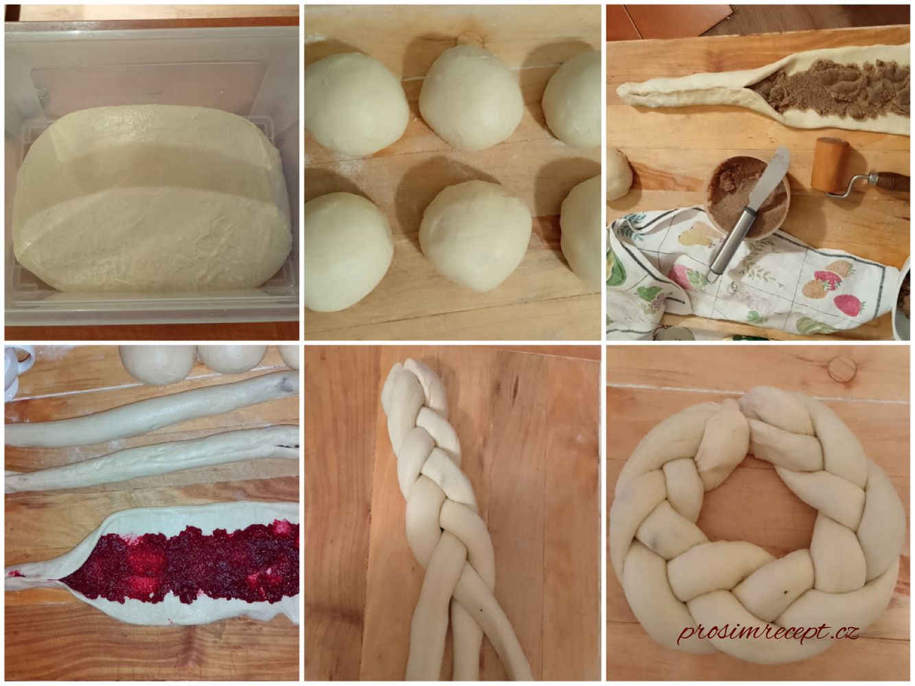 Vypracujeme v robotu z LM, mléka, cukru, citronové kůry, vejce, mouky a soli těsto, do kterého zapracujeme nakonec změklé sádlo a máslo. Těsto, které musí být hladké a nesmí se lepit, necháme vykynout. V chladnější místnosti kyne přes noc, trvá to 10 - 12 hodin.
