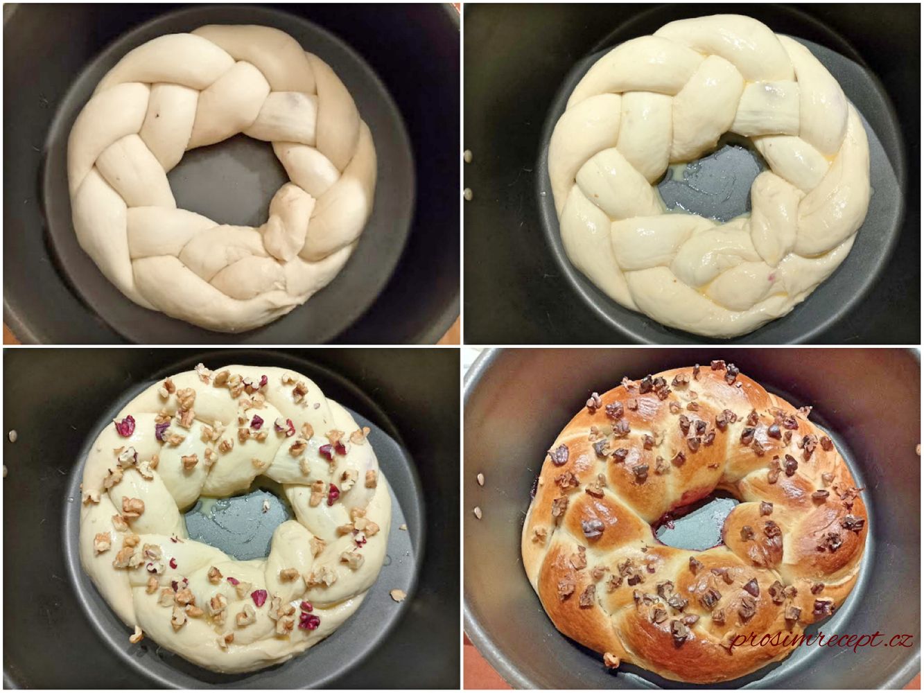 Vykynuté těsto rozdělíme na šest kusů, stočíme do kuliček a necháme odpočinout. Na každý věnec si připravíme tři válečky, ty rozválíme a namažeme nádivkou, každý stočíme. Z naplněných tří válečků upleteme cop který stočíme do tvaru věnce a vložíme do remosky kde kyne asi 3-4 hodiny. Vykynutý věnec potřeme vejcem a posypeme sekanými ořechy.