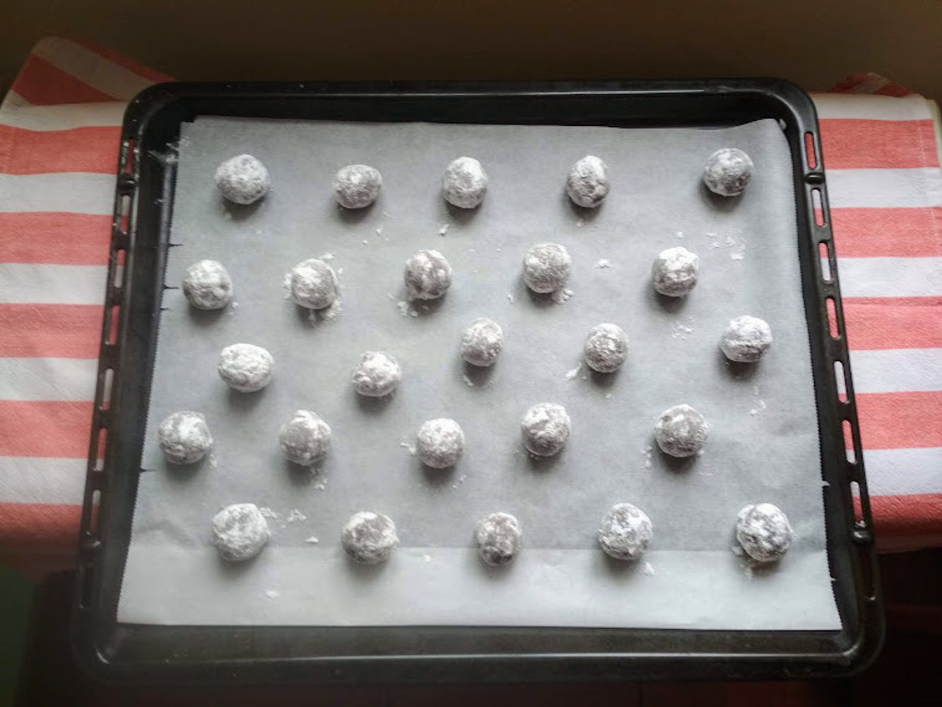 Z těsta tvoříme malé kuličky, které obalíme v moučkovém cukru a klademe na plech s pečícím papírem.