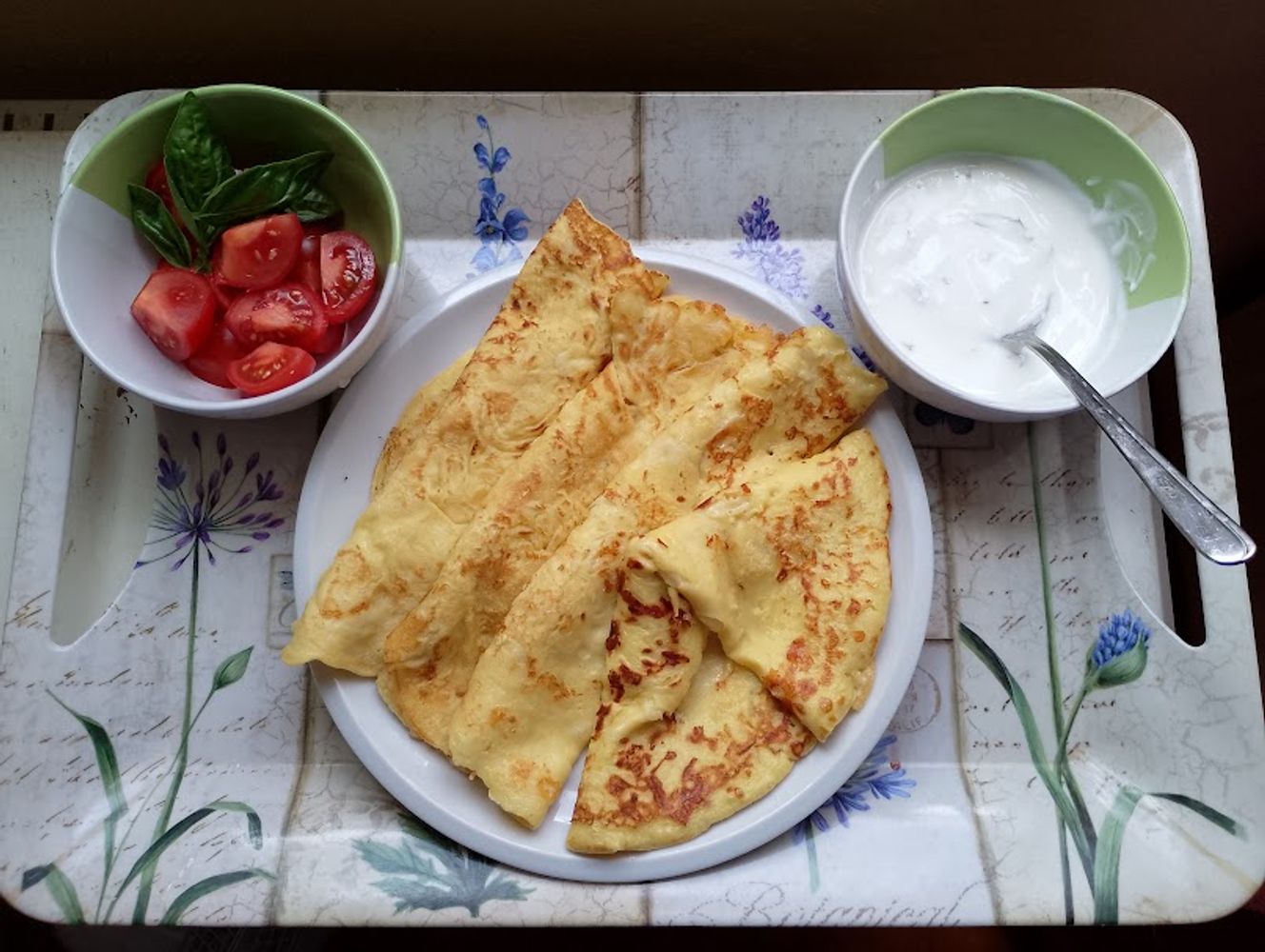 Palačinky na slano, s cuketou a sýrem. Z dávky jsou čtyři velké palačinky.