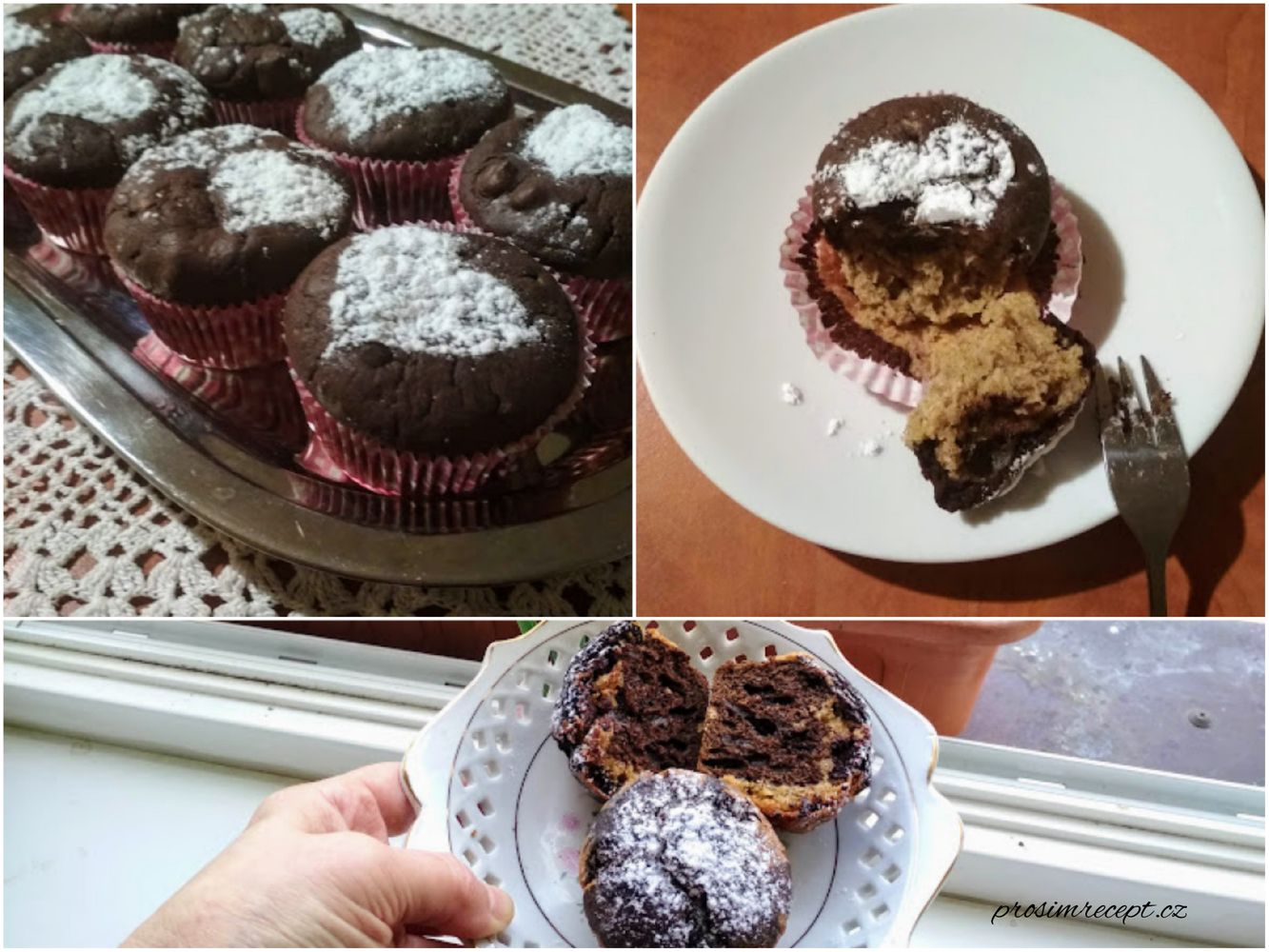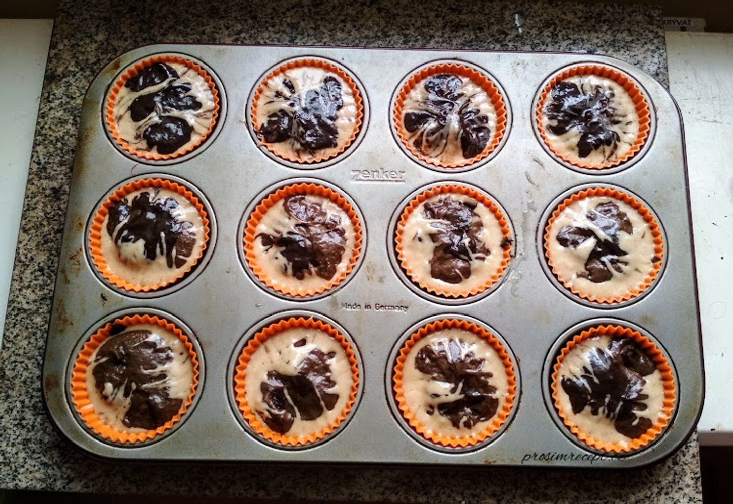 Tmavé těsto: do zbytku těsta přidáme 150 g smetany a kakao a rozmícháme. Tmavé těsto přidáme do formiček.