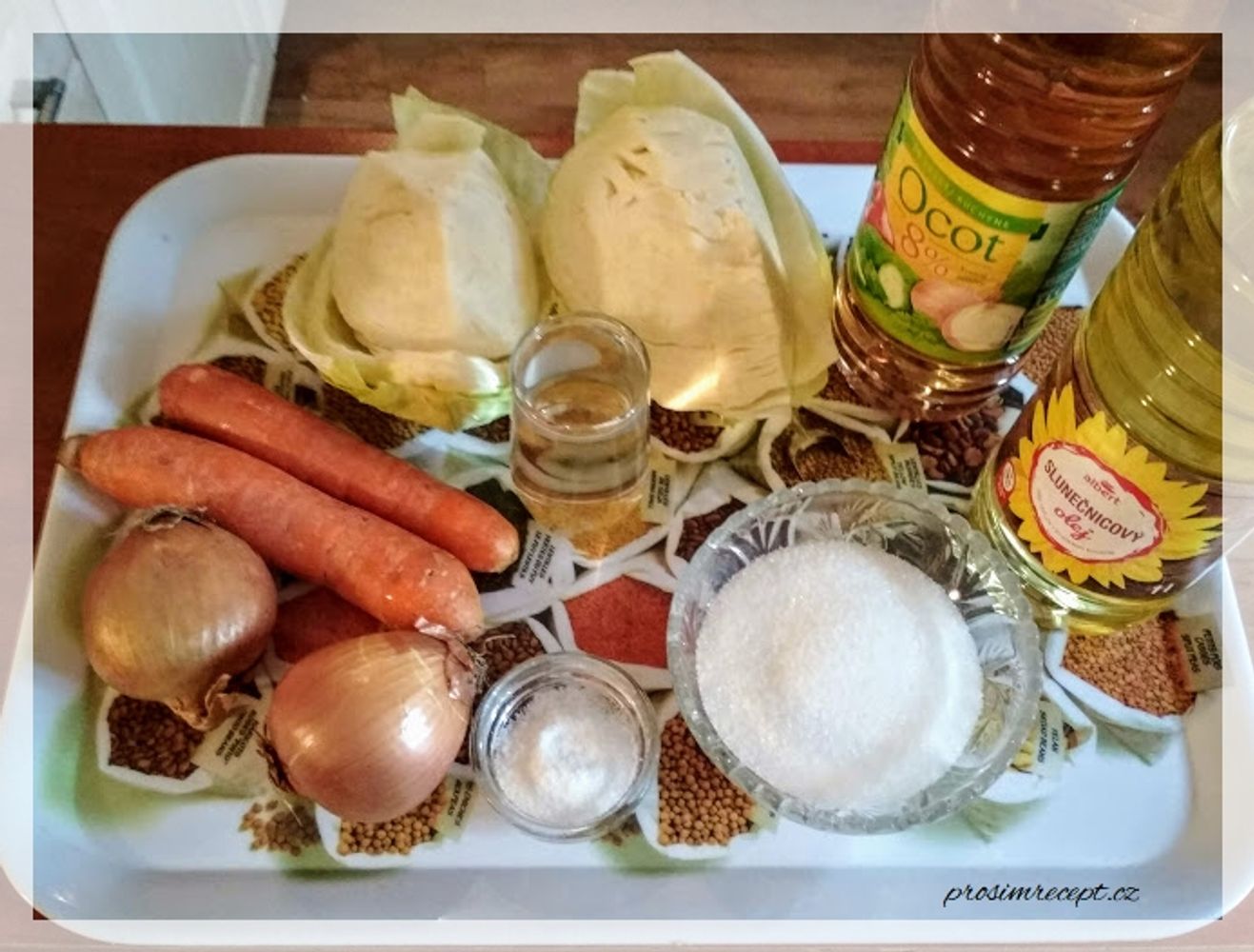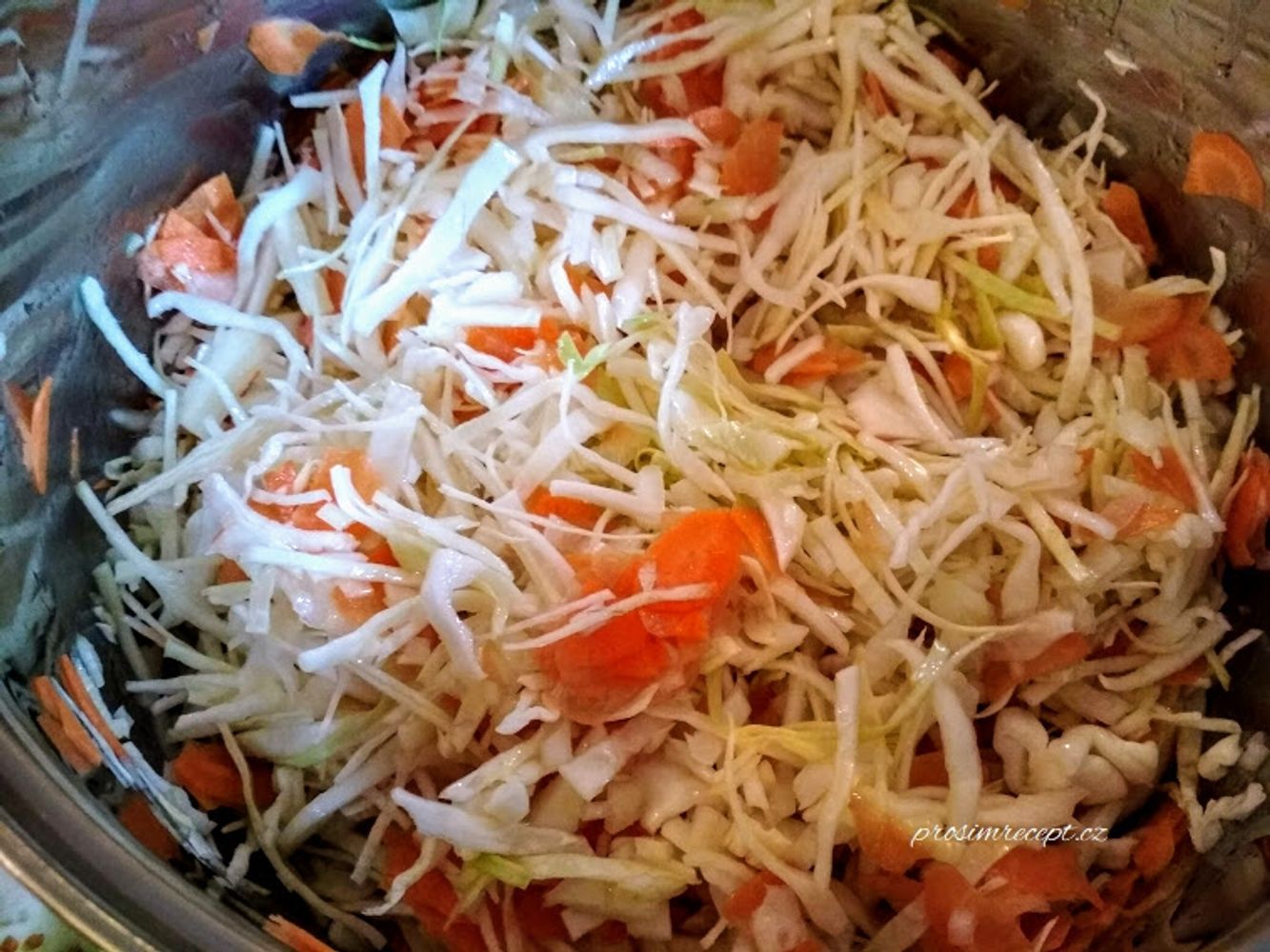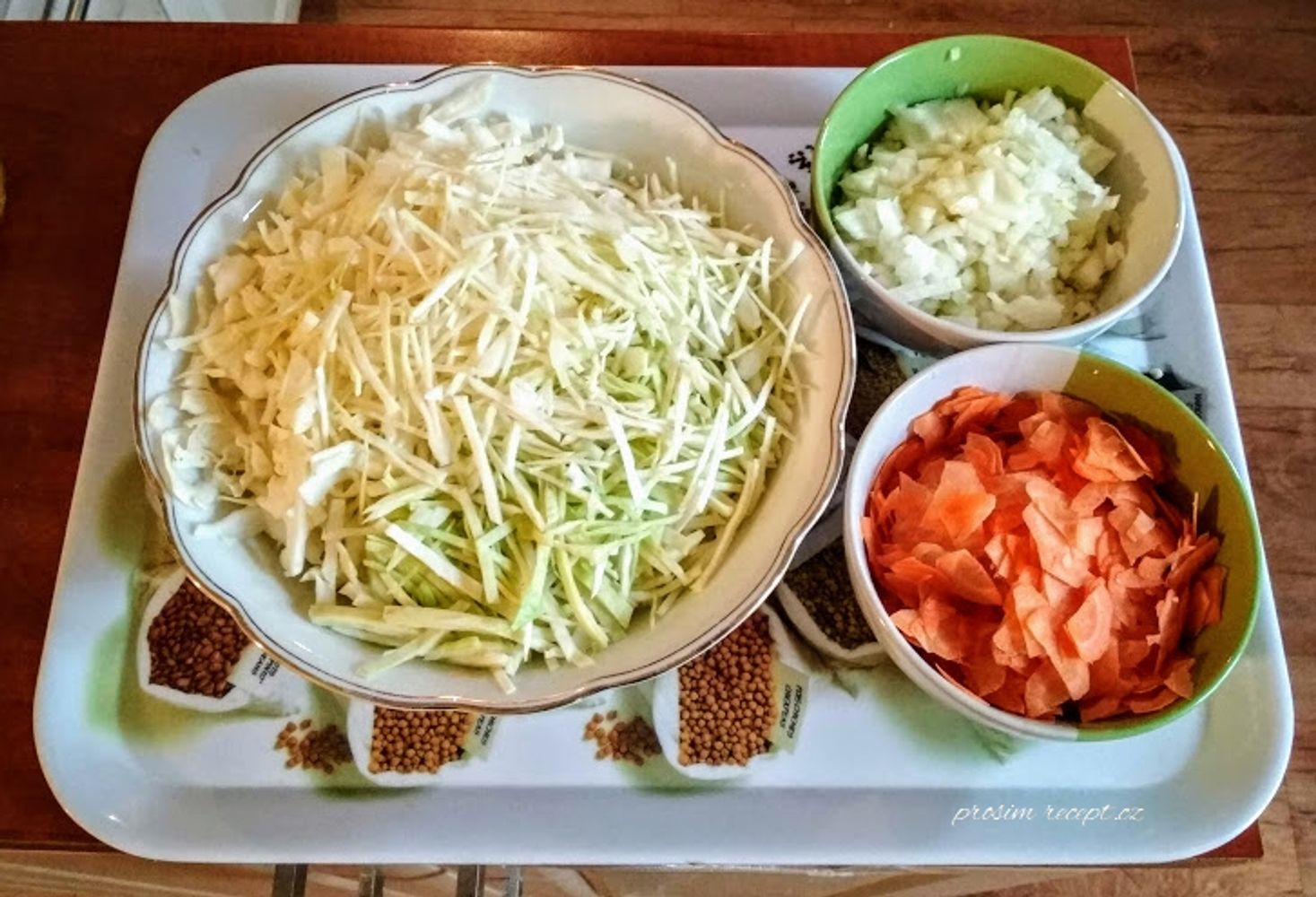 Zelí nakrájíme, přidáme strouhanou mrkev a nakrájenou cibuli. Ve vodě s octem rozpustíme na sporáku cukr, sůl, přidáme olej. Nálev zahříváme, ale nevaříme.