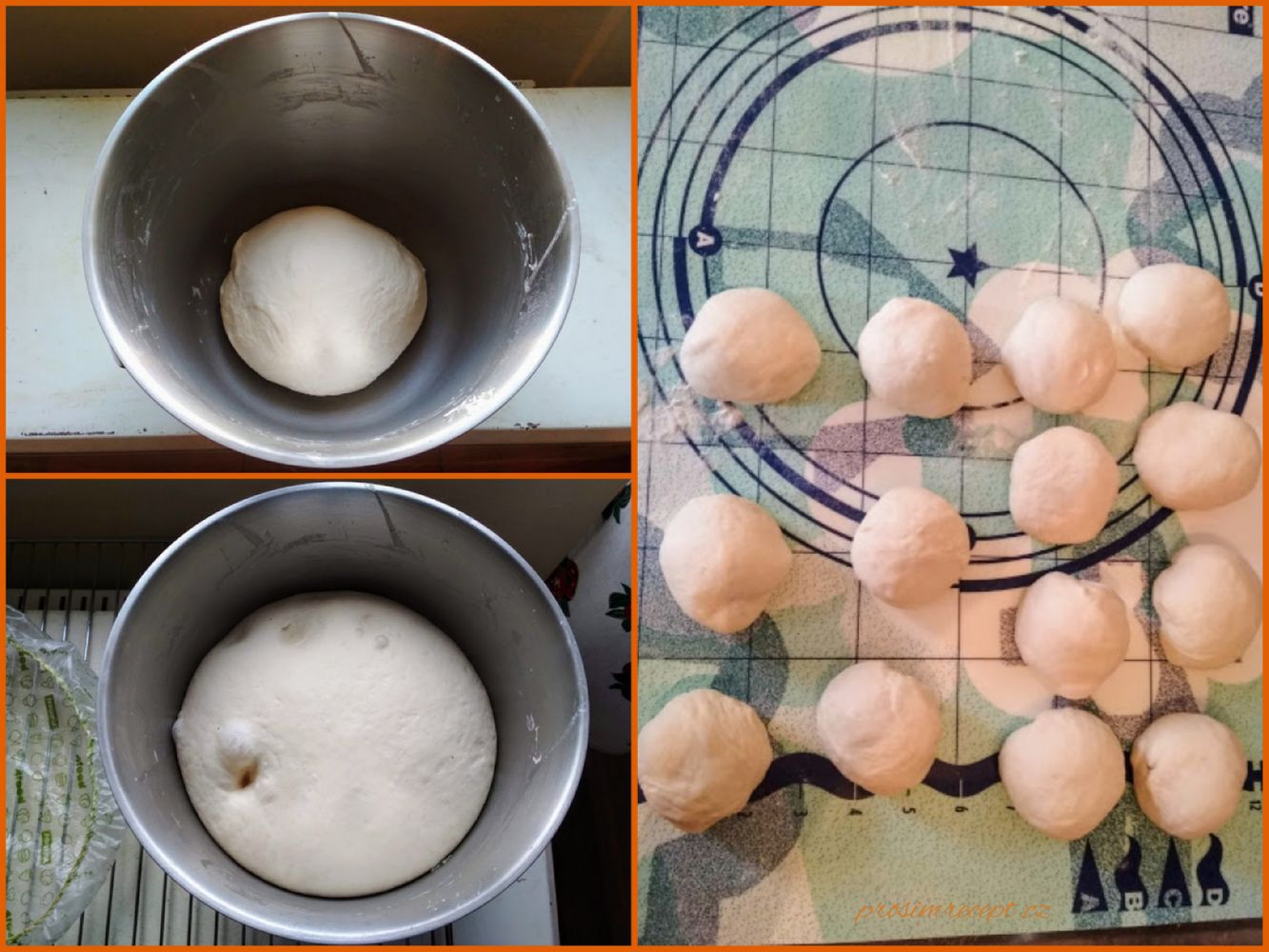 Vykynuté těsto (kyne asi dvě hodiny) rozvážíme na 14 kousků cca 70 g, každý propracujeme a necháme 20 minut odpočinout. Potom stočíme rohlíky, které necháme vykynout (trvá to asi 50 minut).