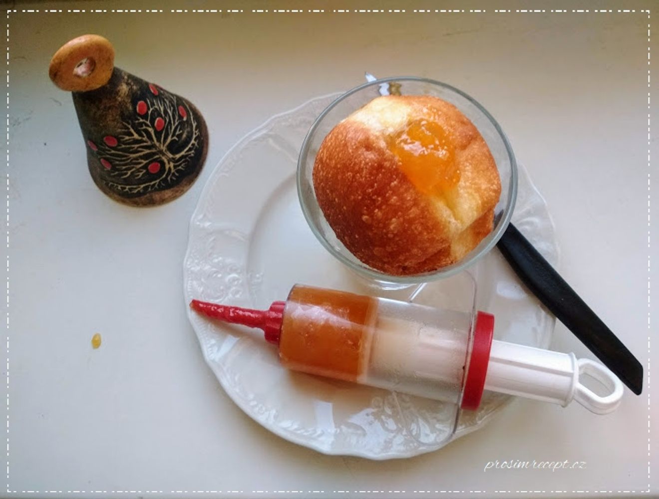 Plníme podle chuti, nejlépe domácí zavařenou, broskvovou, višňovou.