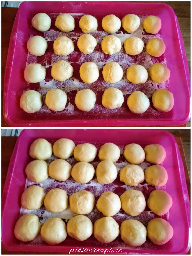 Vykynuté těsto, rozdělíme na 24 kousků, každý stočíme do kuličky, jako chleba švem dolů a necháme kynout na ploše posypané moukou. Přikryjeme a necháme vykynout. Kynutí trvá asi 3-4 hodiny, podle teploty v místnosti.