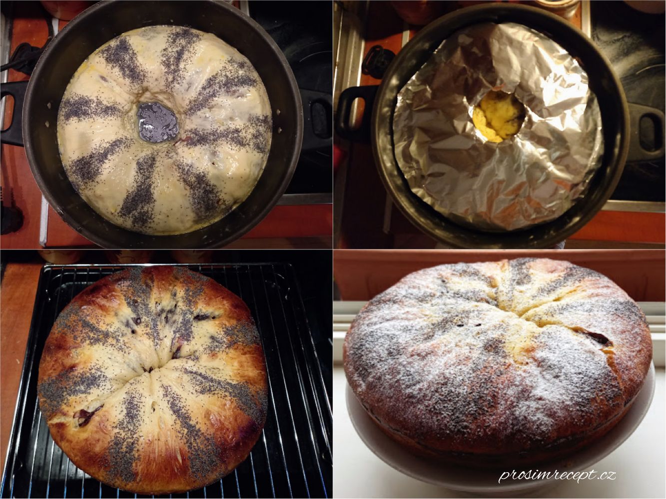 Vykynutý koláč potřeme rozšlehaným vejcem, můžeme posypat mákem. Zapneme remosku a pečeme nejdříve 20 minut. Potom sejmeme nahřáté víko a koláč přikryjeme alobalem ( aby se nepřipálil) a pečeme dalších 30 minut. Remosku vypneme a koláč v ní necháme ještě deset minut dopéct.