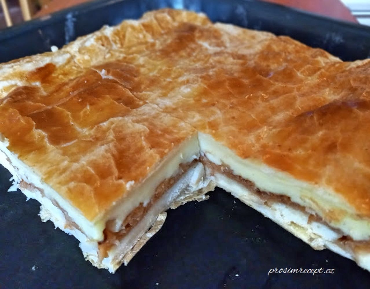 Koláč z listového těsta, piškotů s jablky a pudinkem je letní klasika.
