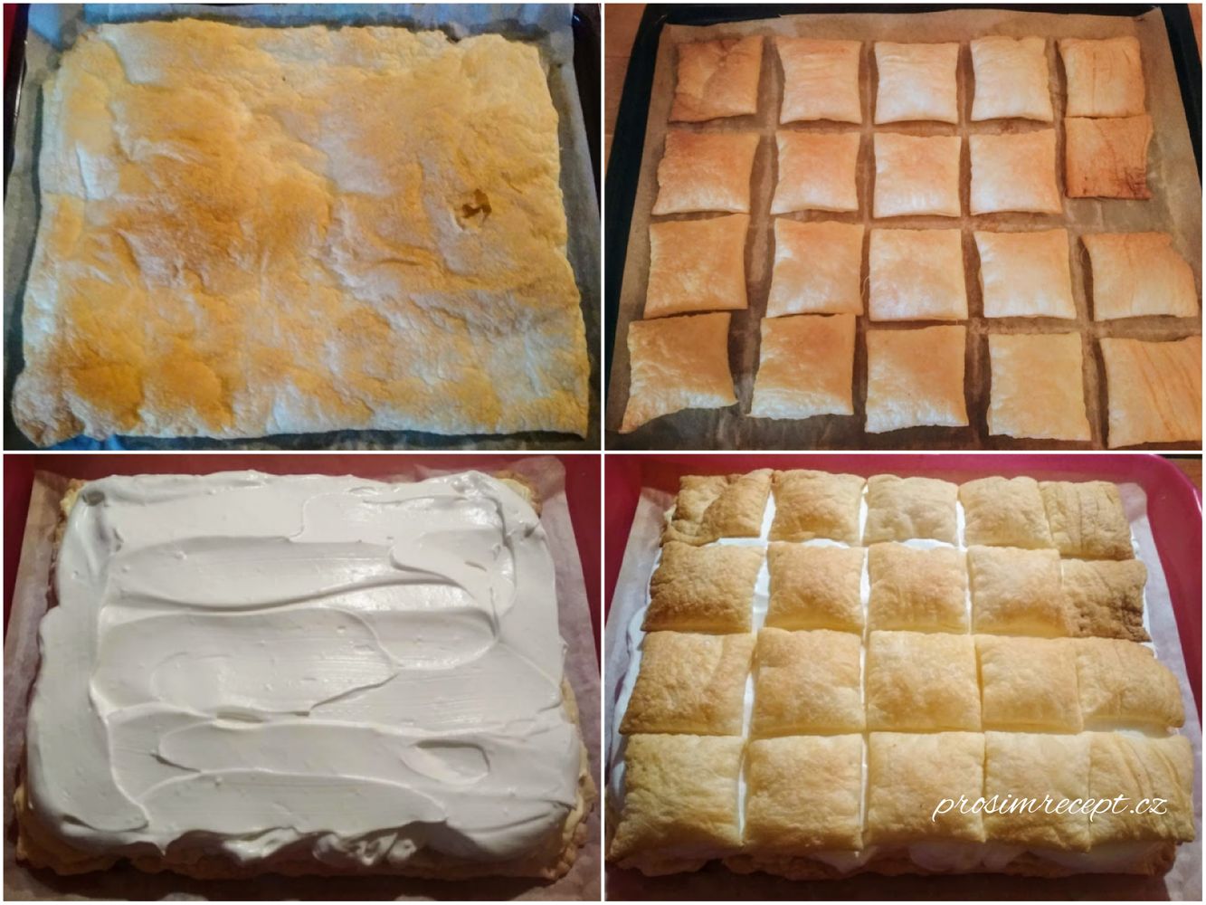 Těsto rozdělíme na dva kusy. Rozválíme na dva stejné pláty. První zůstane vcelku, druhý nakrájíme na čtverce. Těsto pečeme na plechu s pečícím papírem, před pečením vidličkou propícháme.