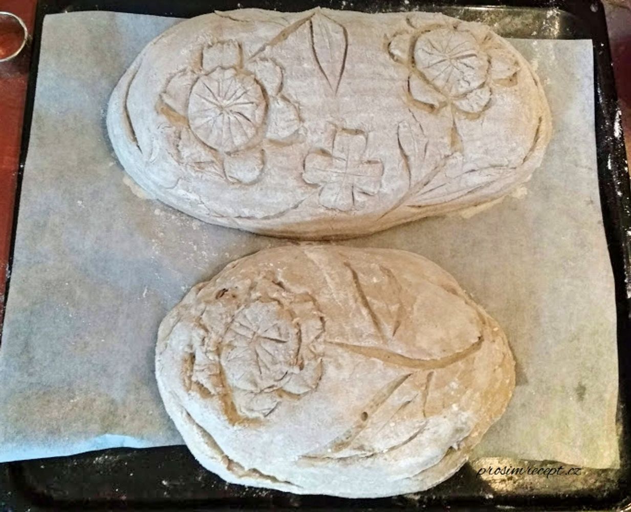 Vykynuté, ale spíše nedokynuté, těsto vyklopíme z ošatky na pečící papír a pomocí žiletky nařezáváme. Jemný dekor řežeme do těsta opatrně, hlubší řezy způsobí hlubší otevření těsta.