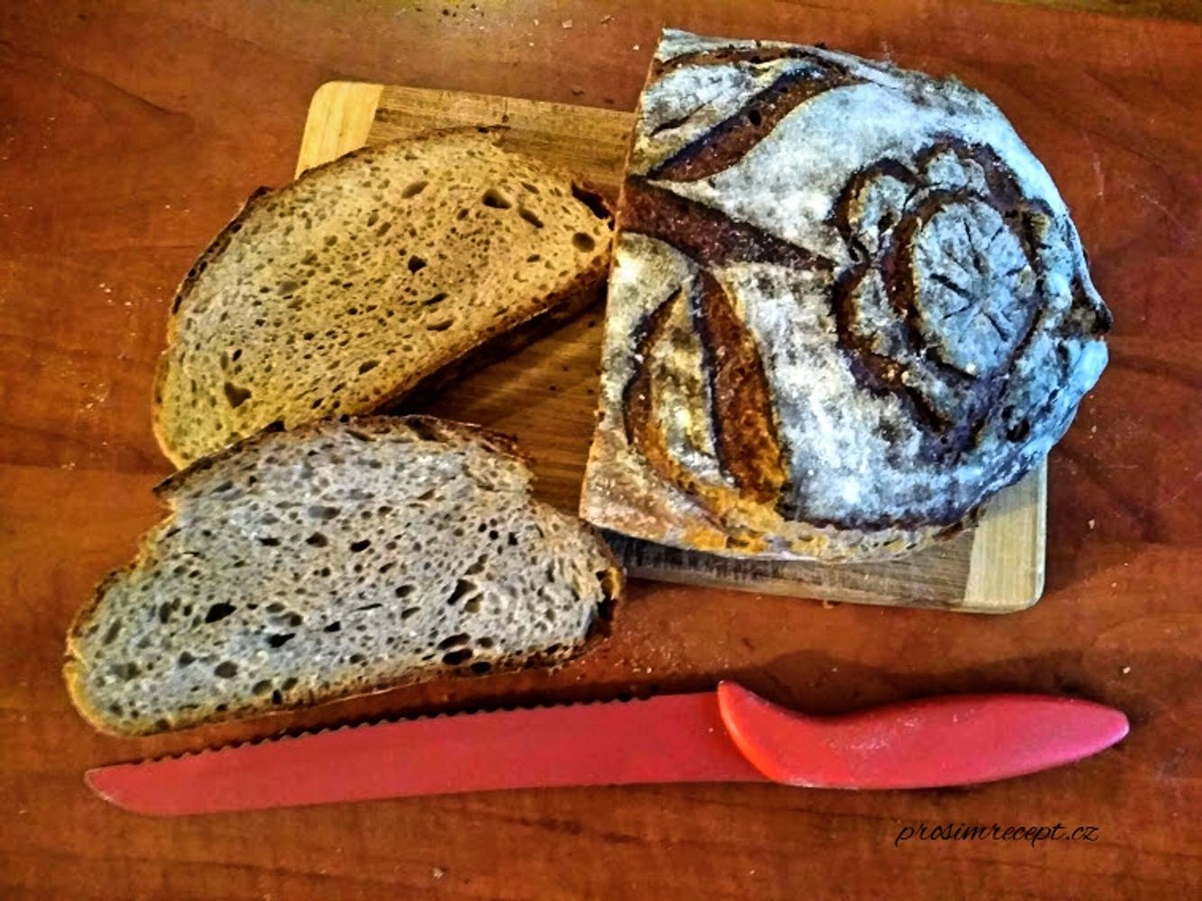 Chleba je dvoukvasový, tentokrát je více pšeničného kvasu než žitného, ale můžeme použít takový kvas, jaký máme. Těsto obsahuje cca 30% žitné mouky, 30 % celozrnné mouky, 20% kvasu a hydratace (včetně kaše) je 75%. Ke kynutí můžeme v zimě využít chladnou chodbu, delší kynutí se projeví na výsledné chuti chleba.