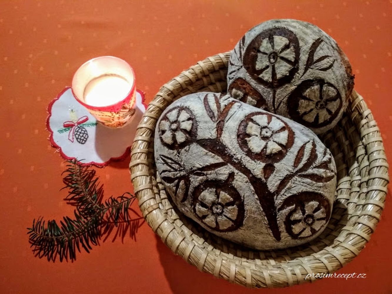 Připravíme si rozkvas ze lžičky žitného kvásku, 50 g žitné chlebové mouky a 50 g vody. (Rozkvas necháme vykvasit, doba je různá, a to podle síly kvásku, 6 i více hodin). Po odebrání rozkvasu do těsta si nezapomeneme vždy nechat alespoň malou lžičku kvásku na příští pečení.