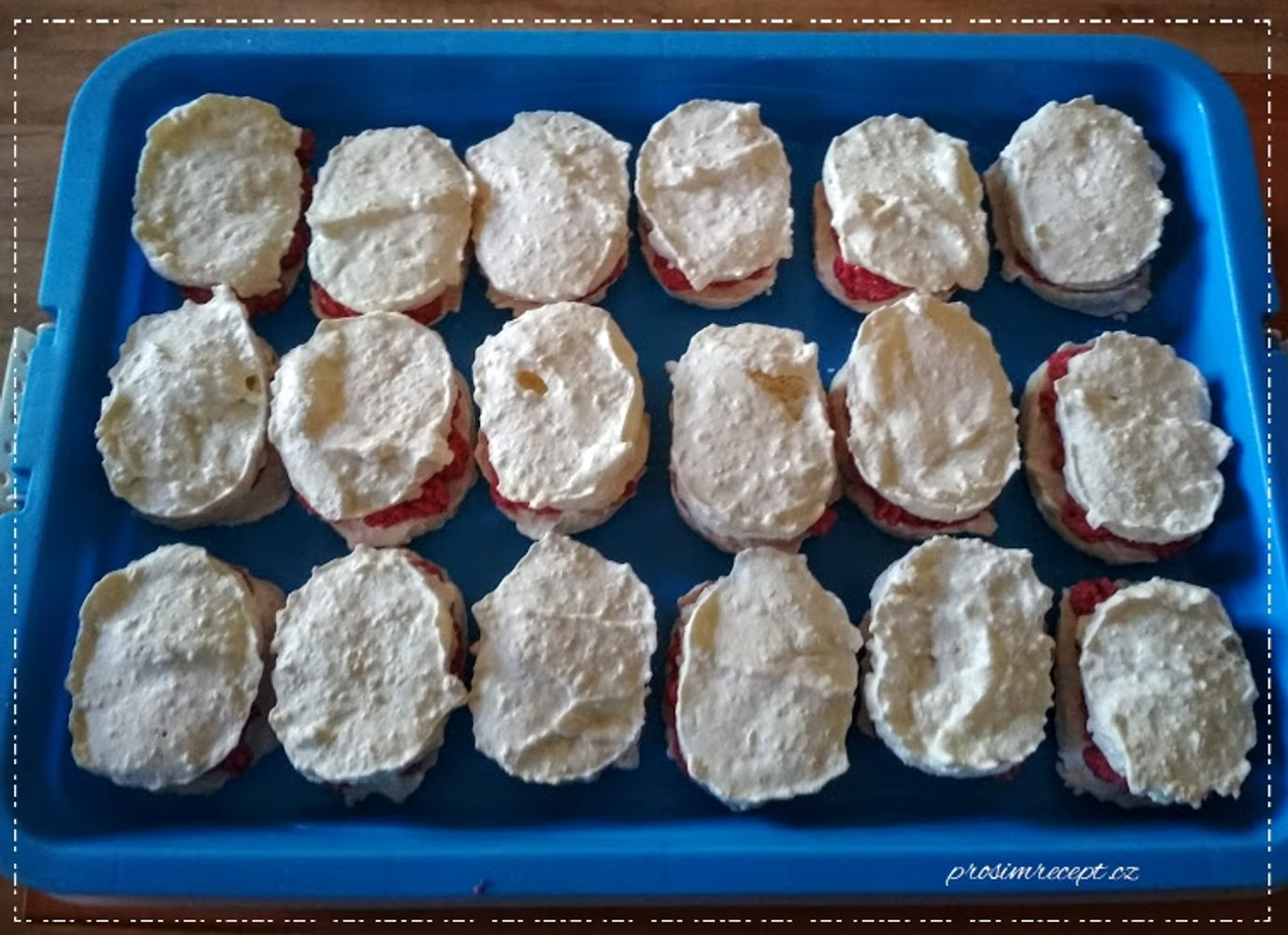 Vychladlé korpusy laskonek plníme pomocí cukrářského sáčku, vždy dvě k sobě, višňovým krémem.