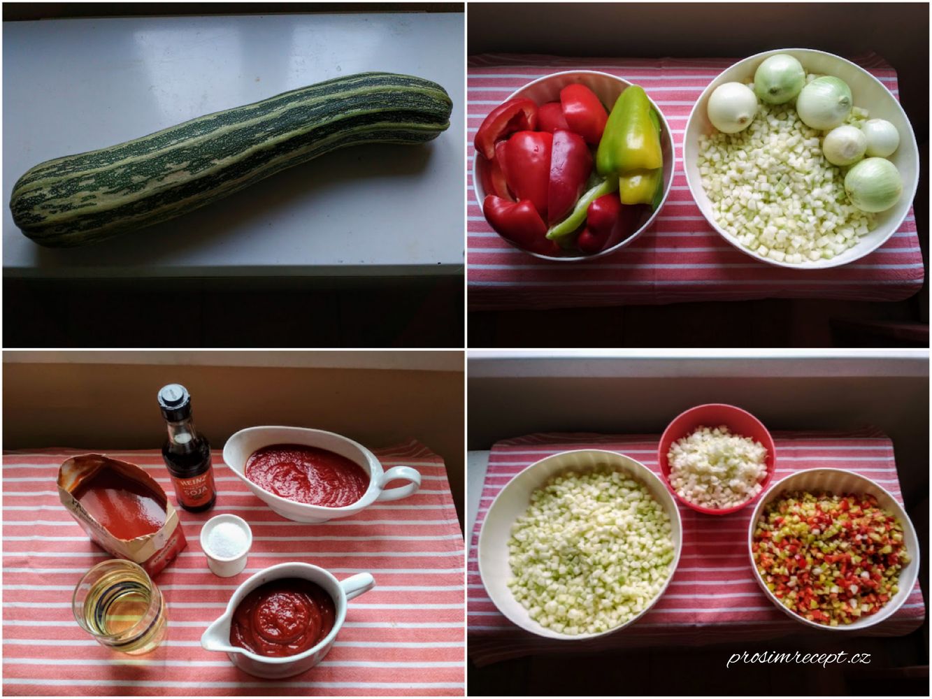 Cuketu oloupeme, papriky očistíme a nakrájíme, nebo nastrouháme v robotu na kostičky. Nakrájíme, nebo nastrouháme, oloupanou cibuli na kostičky.