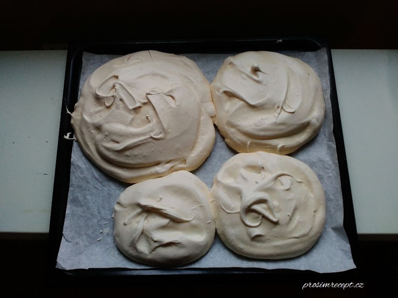 Troubu předehřejeme na 140 stupňů C, vložíme korpusy a krátce zapečeme, snížíme teplotu na 110 stupňů a sušíme nejméně 2 hodiny i více.