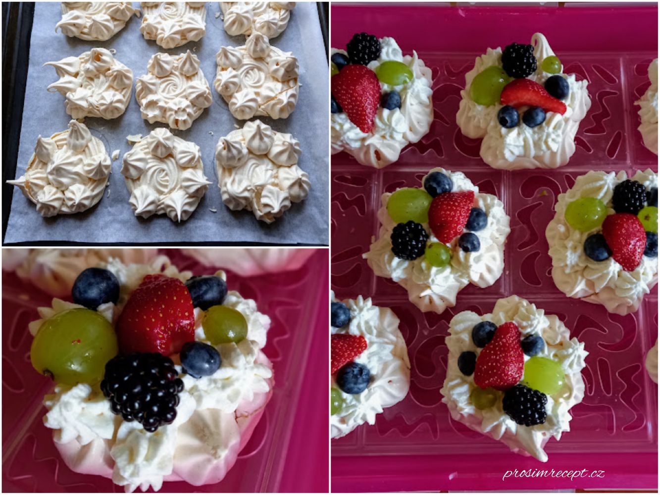 Bílkový dort Pavlova s bílou i pařížskou šlehačkou a ovocem, nebo menší bílkové zákusky zdobené šlehačkovým krémem s tvarohem a ovocem.