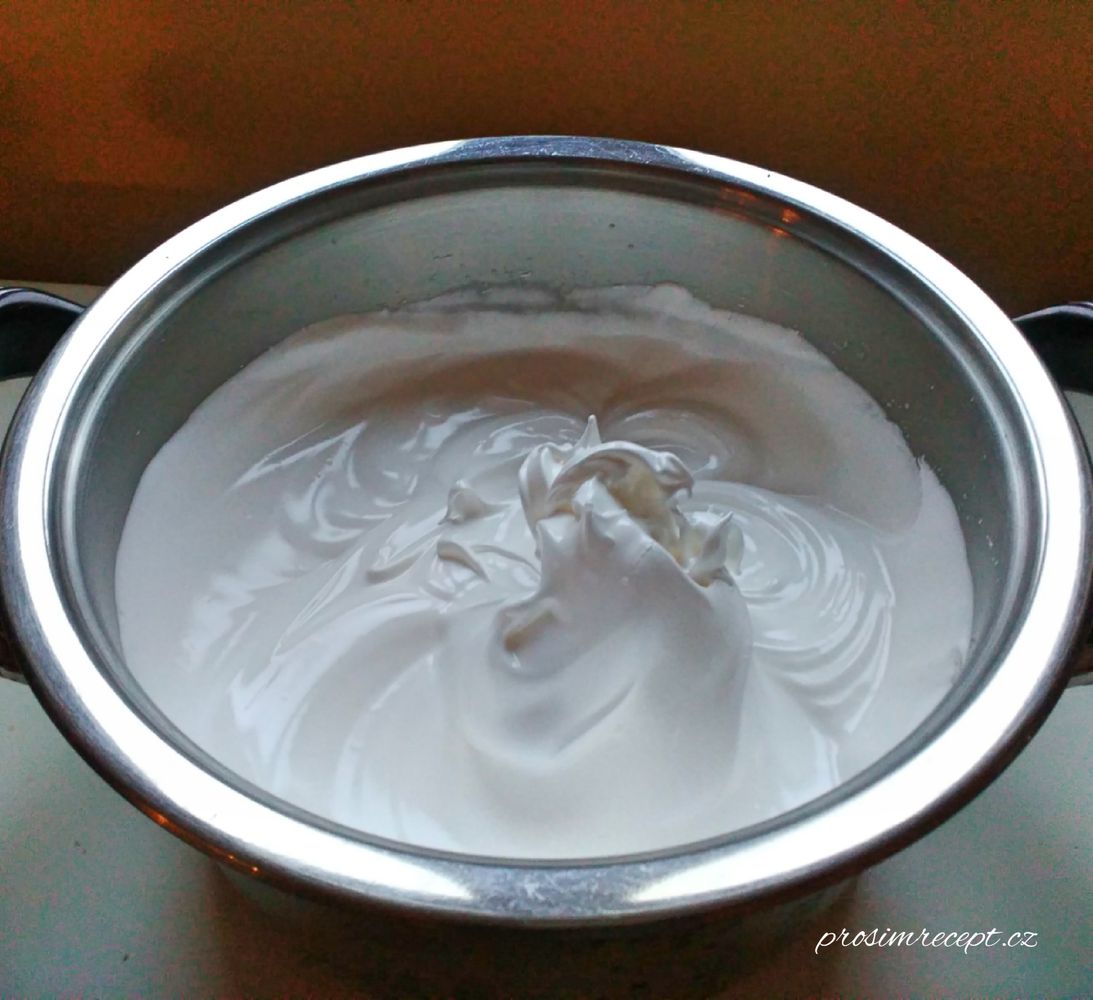 Ušleháme bílky pokojové teploty se špetkou soli, postupně zašleháme cukr, sníh musí dělat ostré špičky. Škrob rozpustíme v octě a opatrně zašleháme do sněhu.