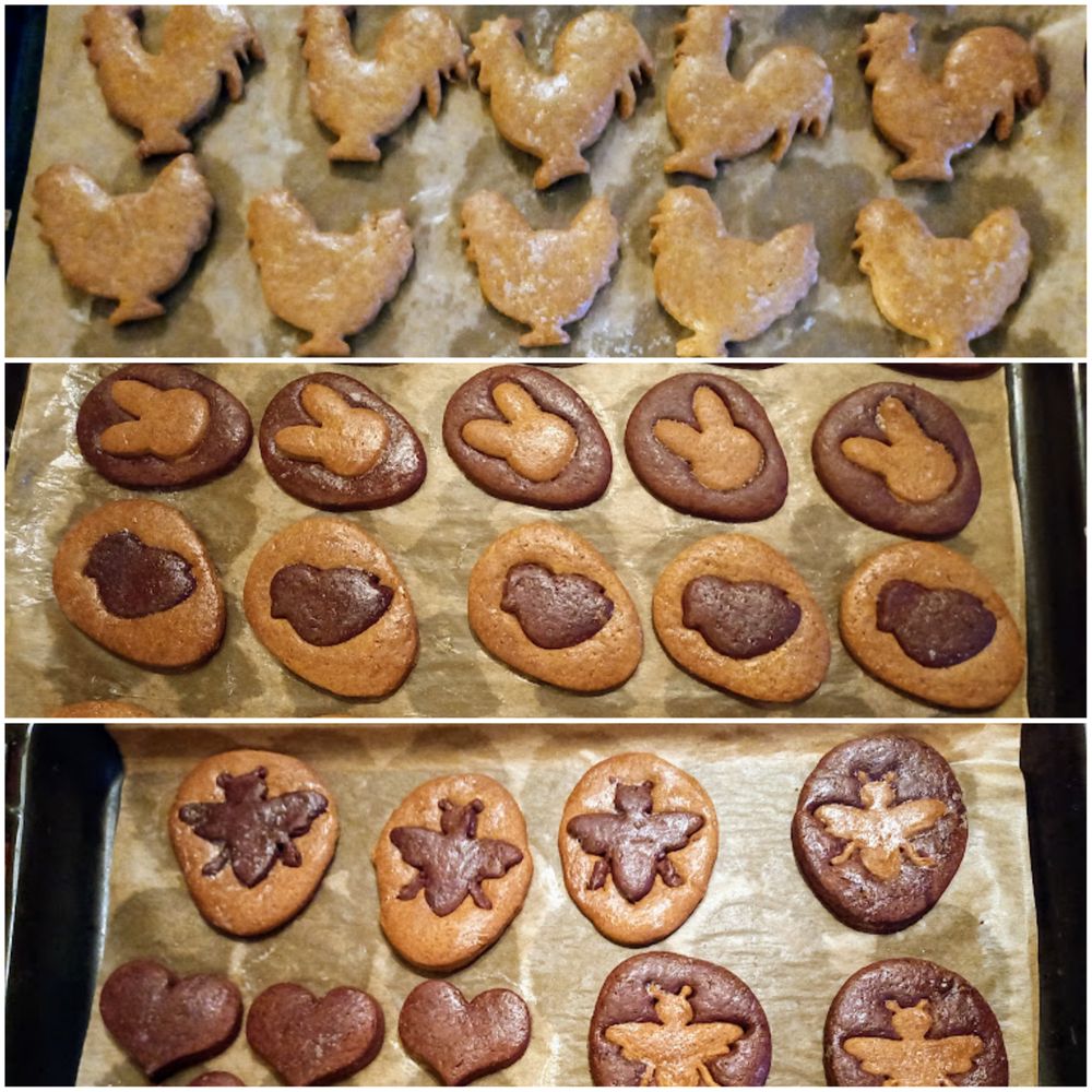 Těsta rozválíme a vykrajujeme libovolné tvary. Kombinujeme světlé a tmavé těsto.