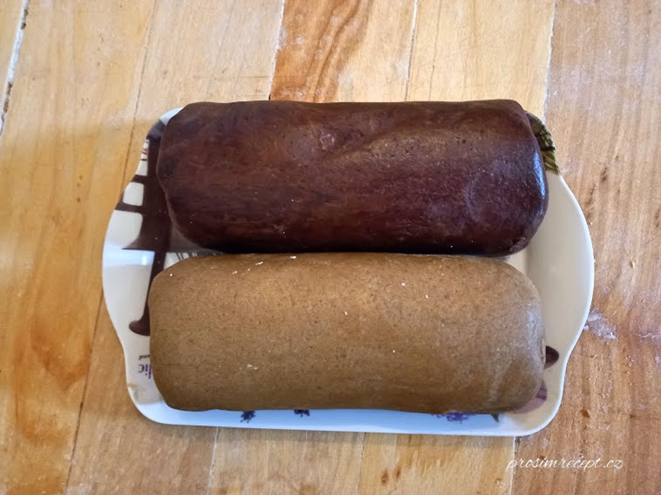 Těsto rozdělíme na dvě poloviny, do první přidáme 2 lžíce mouky a znovu propracujeme. Do druhé přidáme 2 lžíce kakaa a propracujeme.