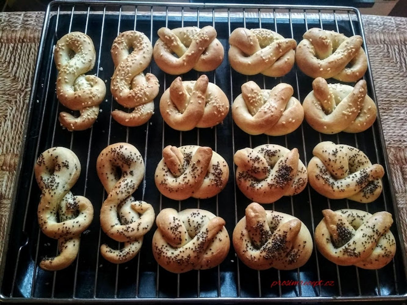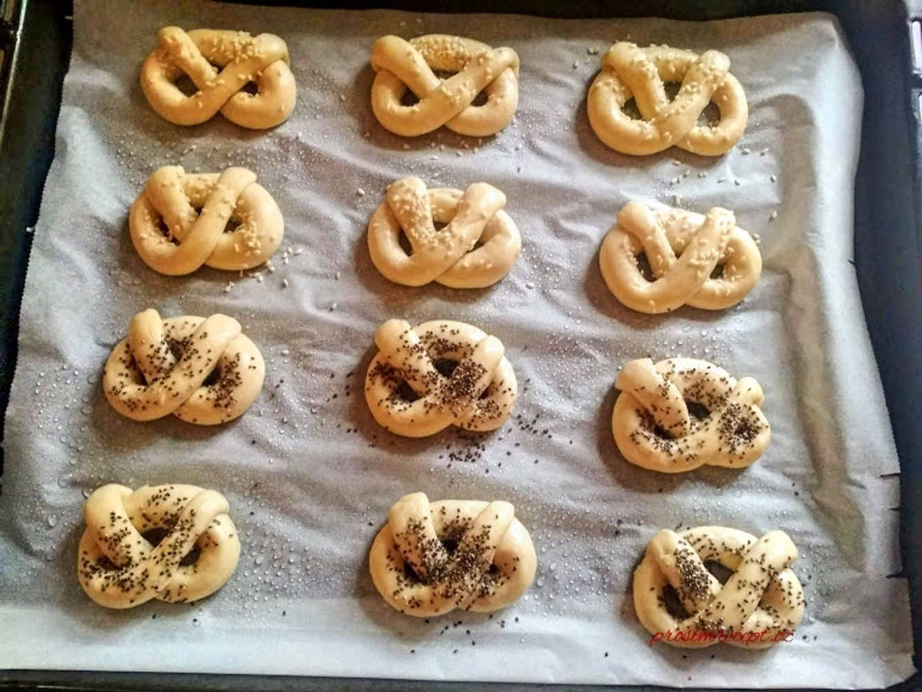 Tvary necháme ještě nejméně hodinu kynout na plechu, vykynuté postříkáme vodou a posypeme semínky.