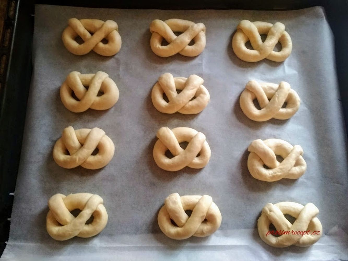 Vykynuté těsto rozvážíme na stejné kousky, ty přeložíme a necháme odpočinout. Z každého kousku vyválíme tyčinku a stáčíme do tvaru preclíku, houslového klíče nebo jiného tvaru.