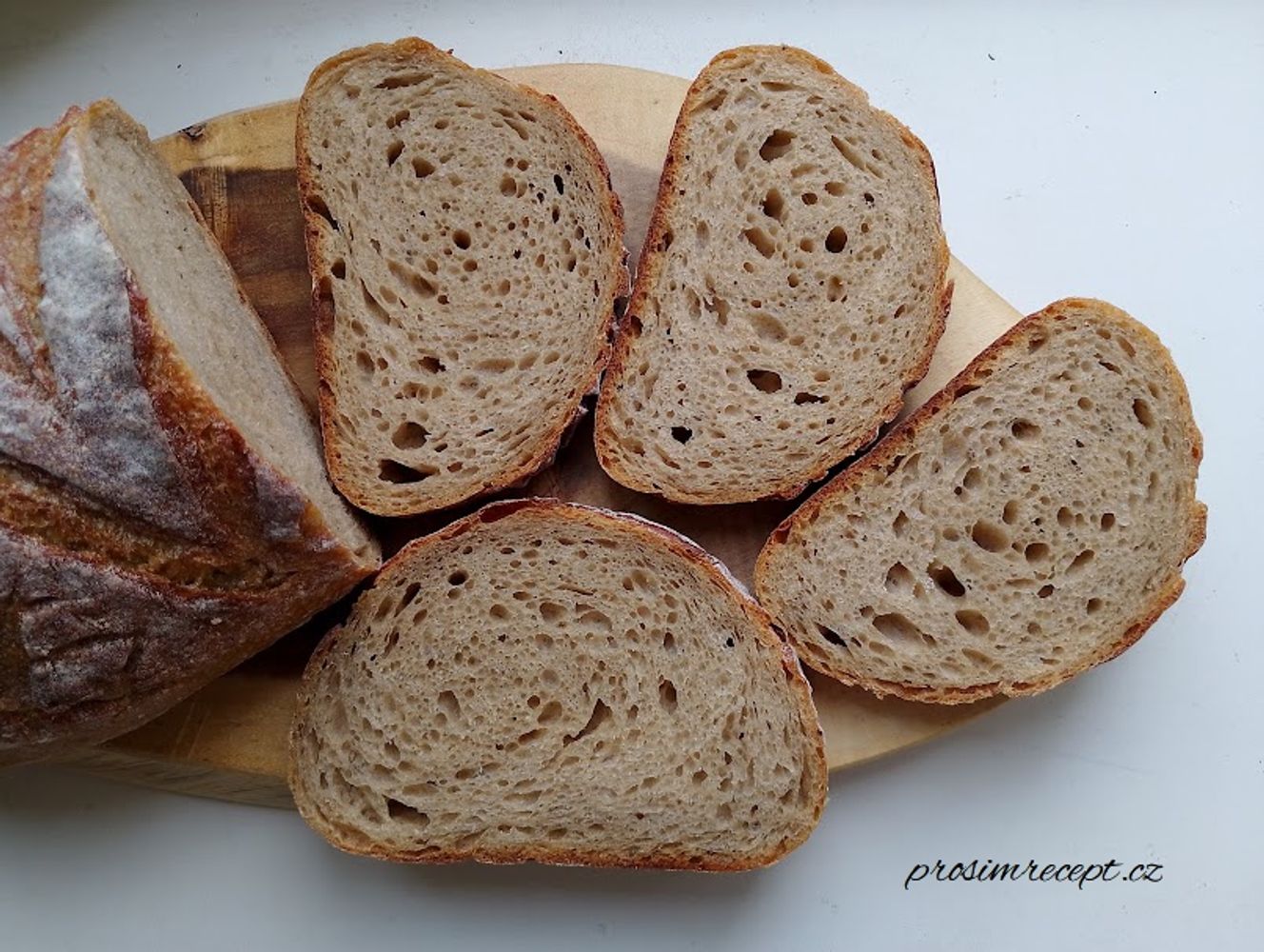 Chleba z žitného kvasu, s žitnou i pšeničnou chlebovou moukou, pivem, solí a kmínem.