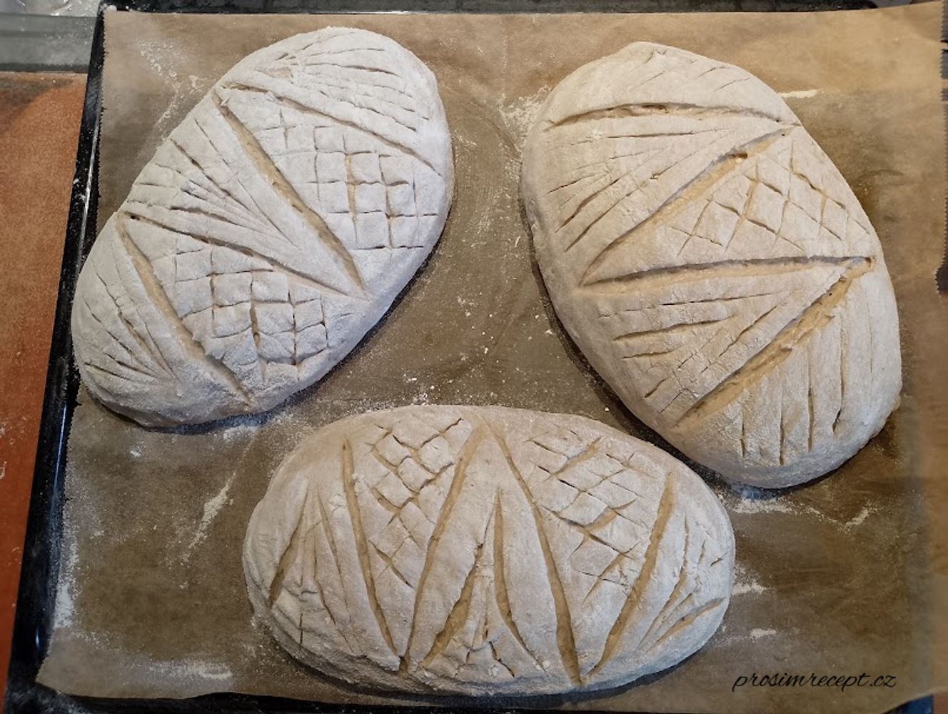 Vykynuté, ale spíše nedokynuté (pokud budeme nařezávat) těsto vyklopíme z ošatky na pečící papír. Chleba pomoučníme a pomocí žiletky nařezáváme, dekor můžeme zvýraznit i střihnutím nůžkami. Jemný dekor řežeme do těsta opatrně, hlubší řezy způsobí hlubší otevření těsta.