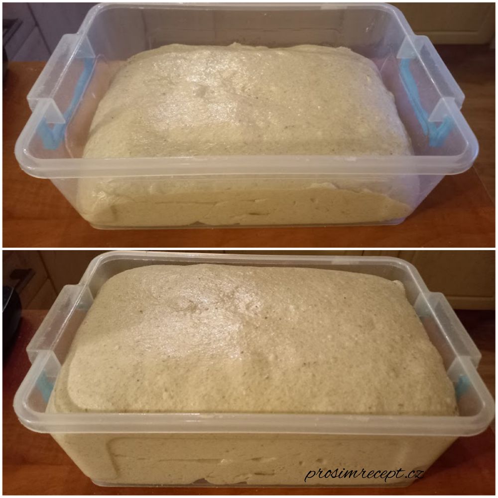 Pak přidáme kmín a sůl s vodou (asi 50 g), těsto hněteme 8 minut. Těsto vyndáme na vlhkou desku, mouku už nepřidáváme, rukama ještě propracujeme a uložíme do průhledné krabice, dno potřeme olejem.