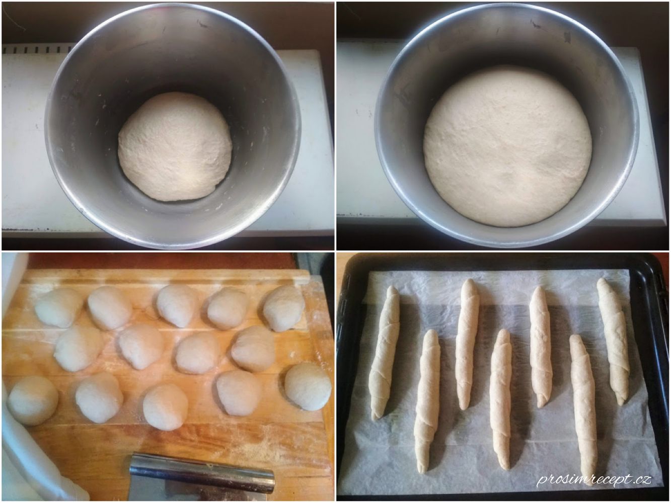 Vykynuté těsto (kyne asi dvě hodiny) rozvážíme na 14 kousků cca 72 g, každý propracujeme a necháme 20 minut odpočinout. Potom stočíme rohlíky, které necháme vykynout (trvá to asi 50 minut).