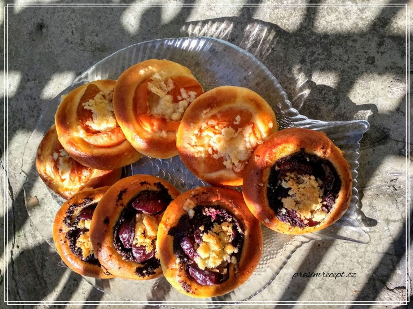 Do vykynutých kuliček uděláme důlek, naplníme makovou nádivkou a vypeckovanými švestkami, posypeme drobenkou. Koláče kynou na plechu, přikryté igelitovým pytlem.