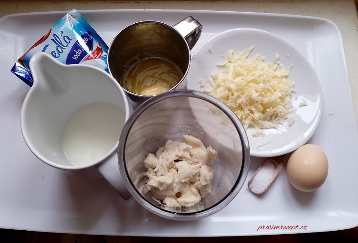 Kvásek roztrháme na malé kousky, přidáme mléko, rozpuštěné vychladlé máslo, vejce, sůl a nakonec sodu. Prošleháme ručním šlehačem do hladkého těsta, přidáme strouhaný sýr a zamícháme.
