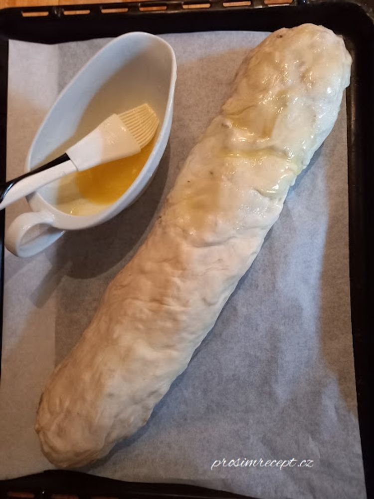 Přeneseme na plech vyložený pečicím papírem, závin ještě potřeme máslem, a pečeme ve vyhřáté troubě na horkovzduch při 180 °C 25−30 minut dozlatova.