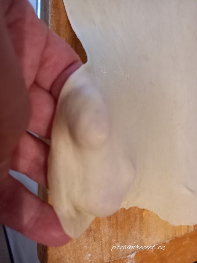 Těsto rozválíme na velmi tenký plát, lehce podsypáváme moukou.