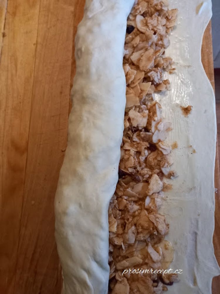 Celou plochu zlehka potřeme rozpuštěným máslem, pouze od okrajů vynecháme asi 2 cm, které nepotíráme. Rozprostřeme připravená jablka a zatočíme.