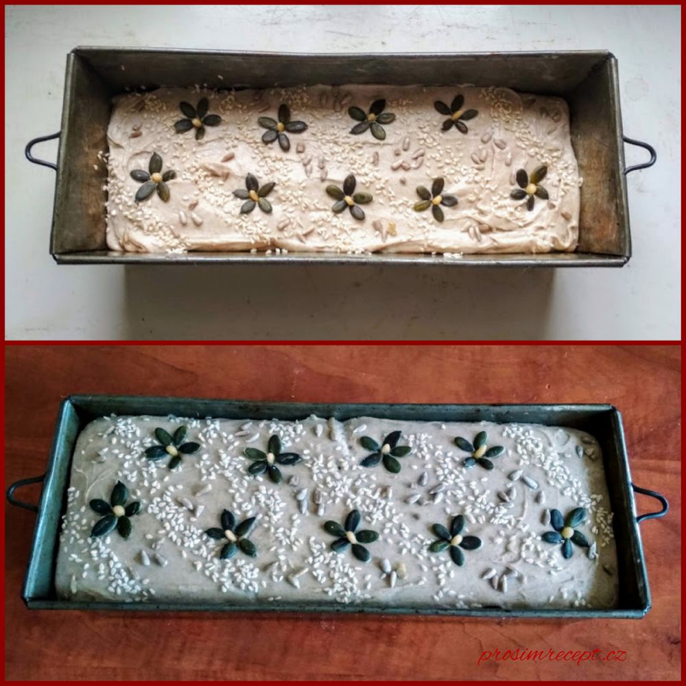 Těstem naplníme formu na chleba, můžeme ozdobit semínky a necháme v teple kynout.